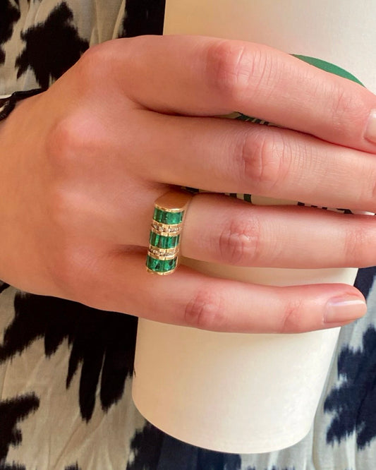ART MODERNE EMERALD, DIAMOND & YELLOW GOLD RING, 1940s