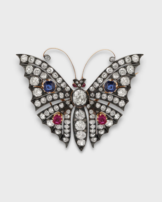 RUBIES, SAPPHIRES, DIAMONDS, SILVER & GOLD BUTTERFLY BROOCH, 1890s