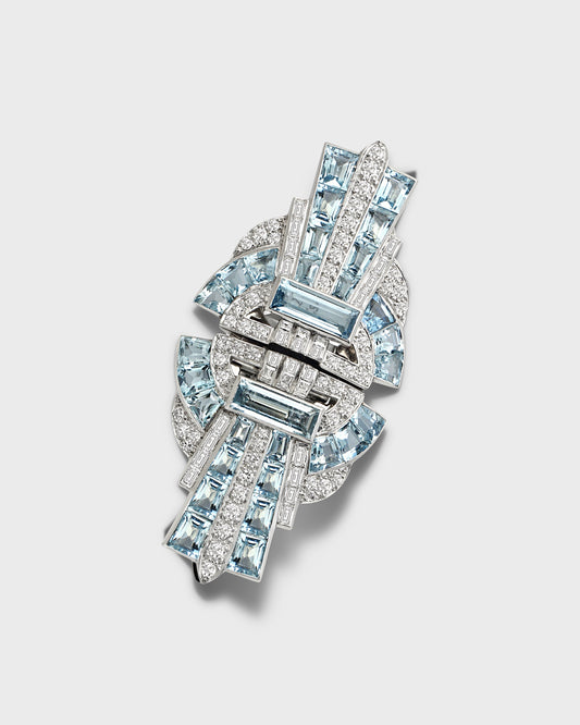 ART DÉCO AQUAMARINES, DIAMONDS & WHITE GOLD DOUBLE BROOCH, 1920