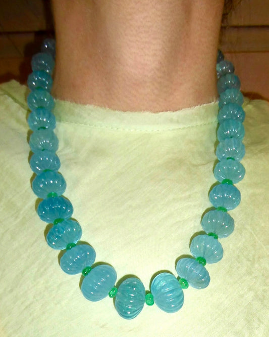 CARVED AQUAMARINE & EMERALD BEADS NECKLACE