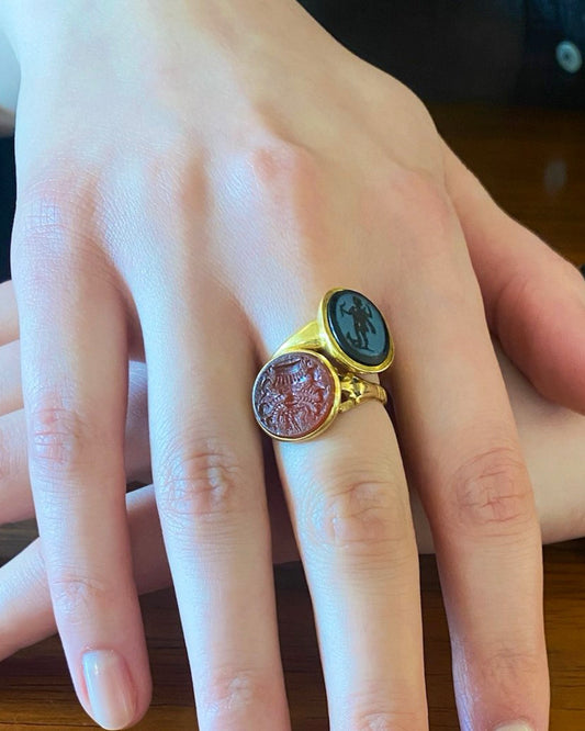 PAIR OF ANTIQUE INTAGLIO, CHALCEDONY, CARNELIAN & GOLD RINGS