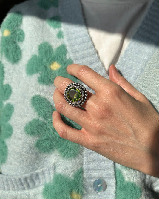 PERIDOT & DIAMONDS ON SILVER & GOLD CLUSTER RING, 1890s
