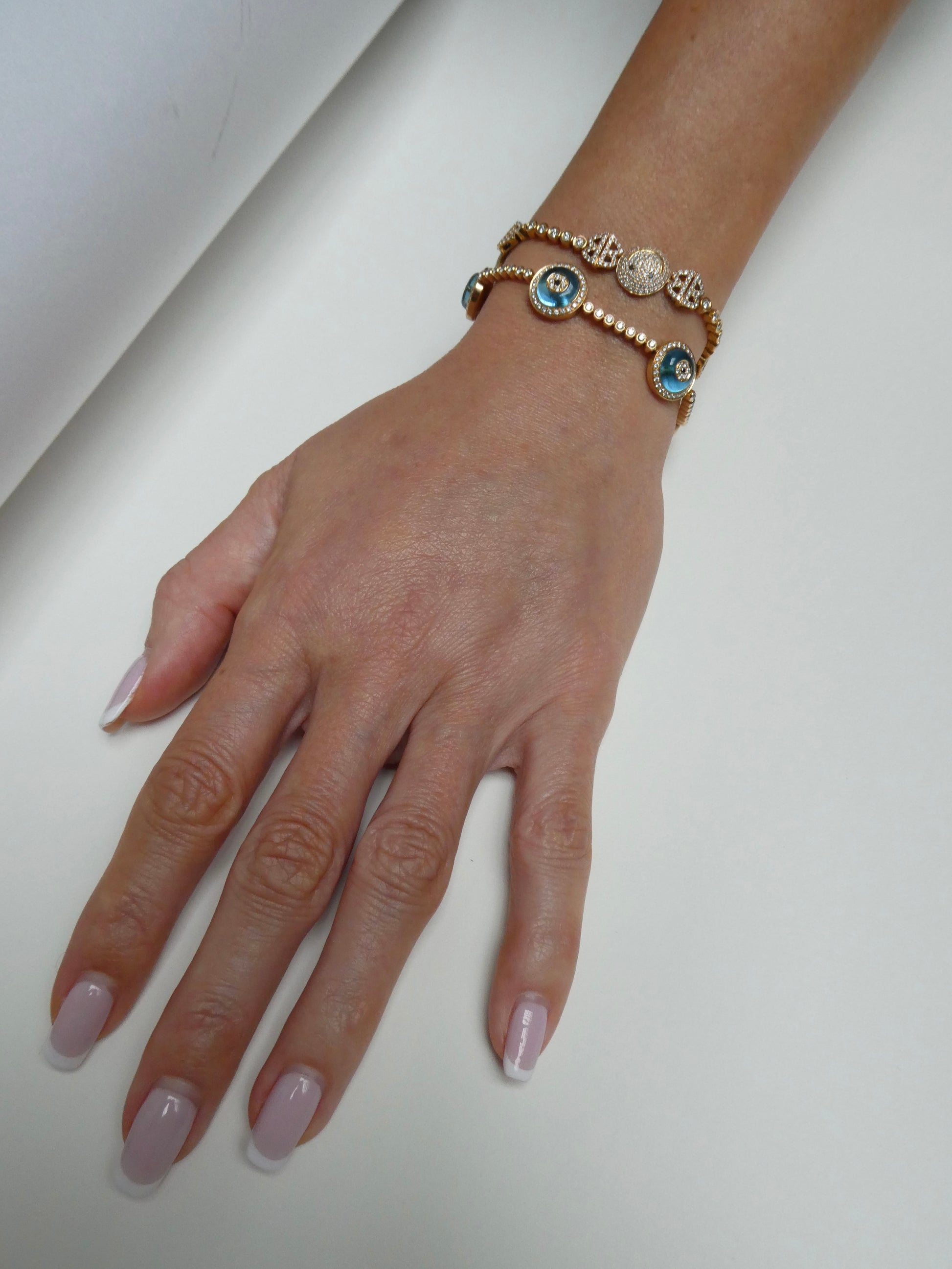 STYLE: As styled in the Gallery, wear it solo for an effortless pop of brilliance or layer it with her Evil Eye or 2B Happy designs for a symbolic, maximalist stack. The gold and diamond radiance complements both daywear and evening glamour, catching light —and smiles— wherever you go.